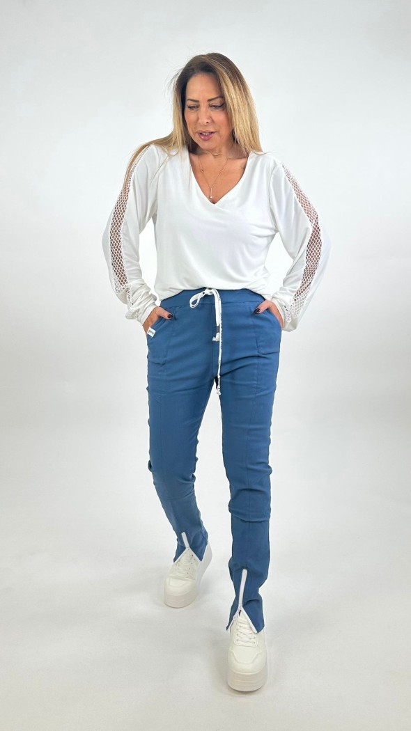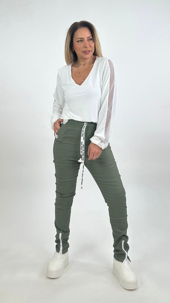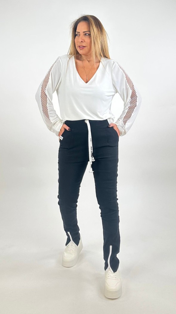 העיצוב כולל פסים לבנים לאורך הרגל שמוסיפים סטייל ומדגישים קו ארוך ונקי.
