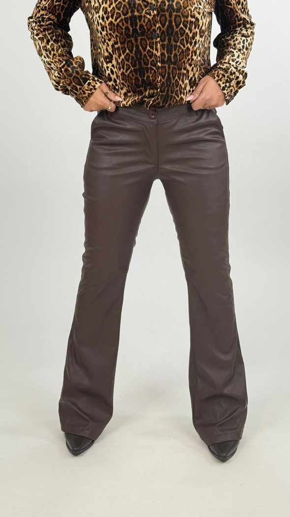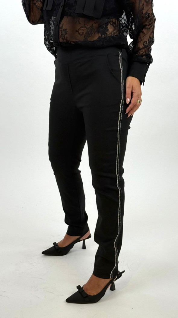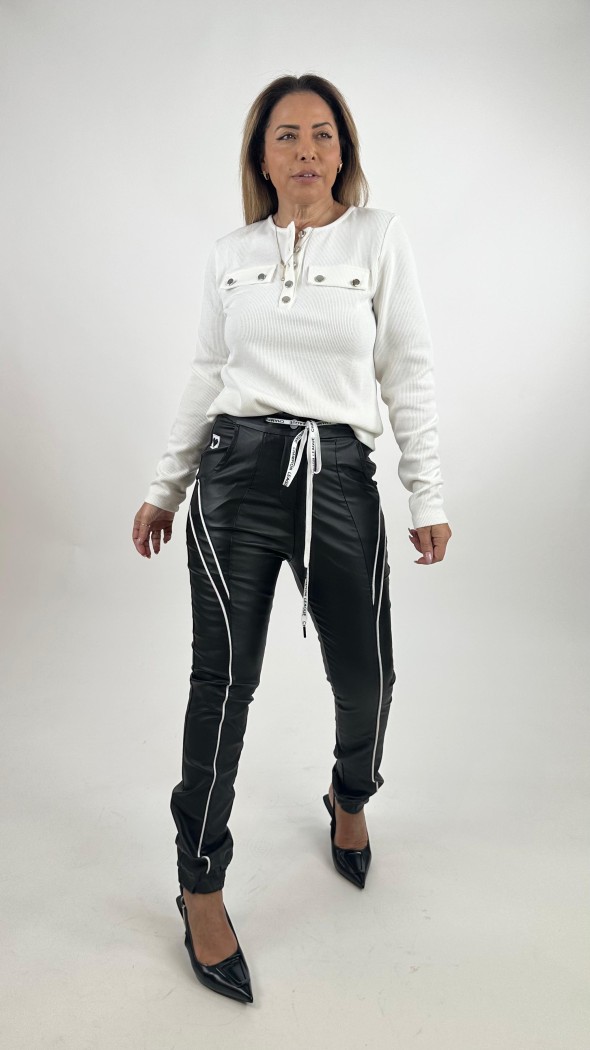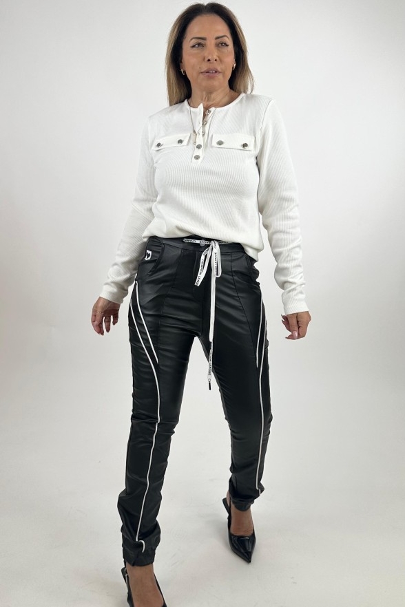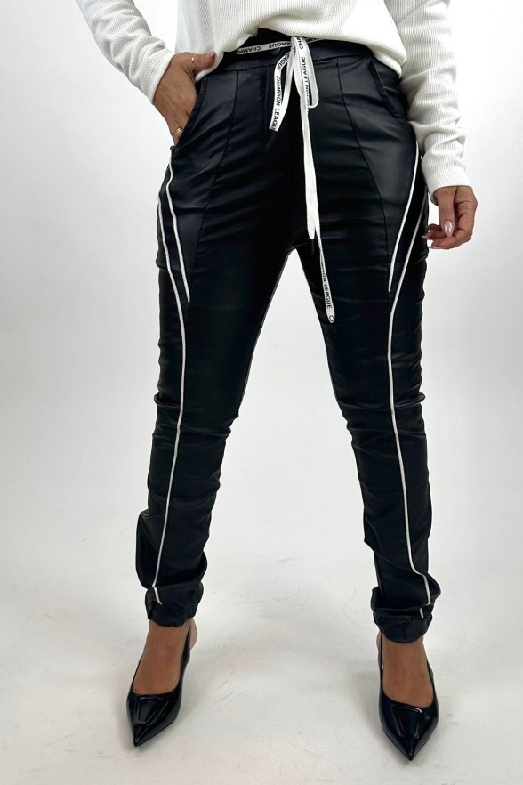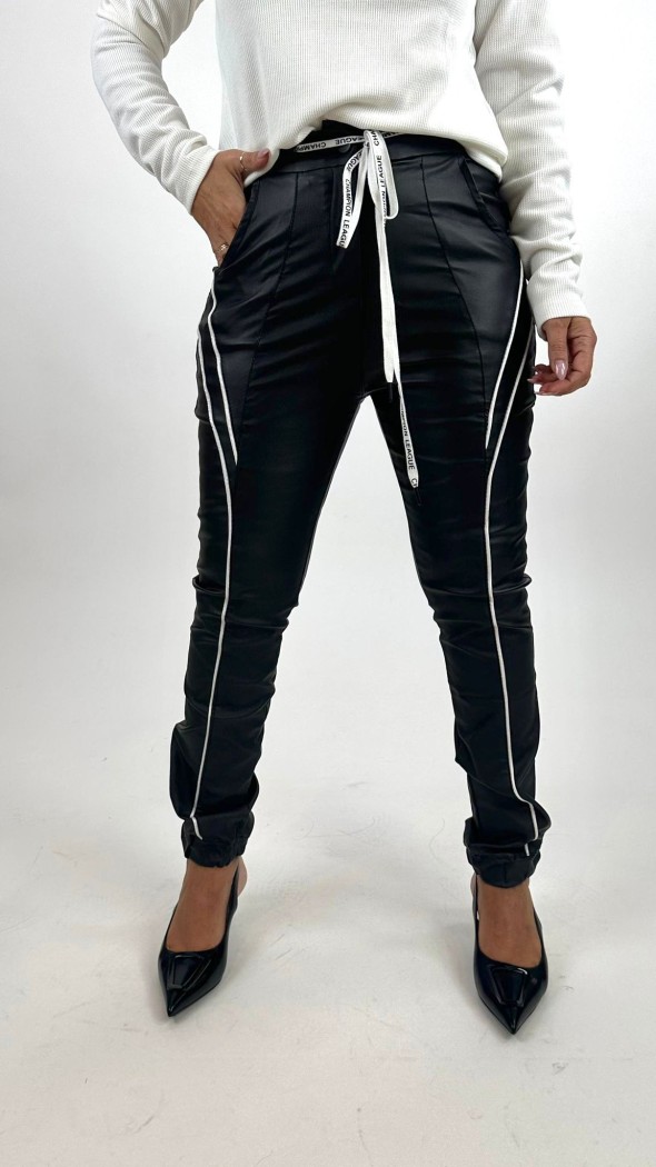 מכנס דמוי עור בגזרה צרה ומחטבת בשילוב פסים לבנים לאורך, עשוי בד רך עם מראה עור חלק ונעים למגע.