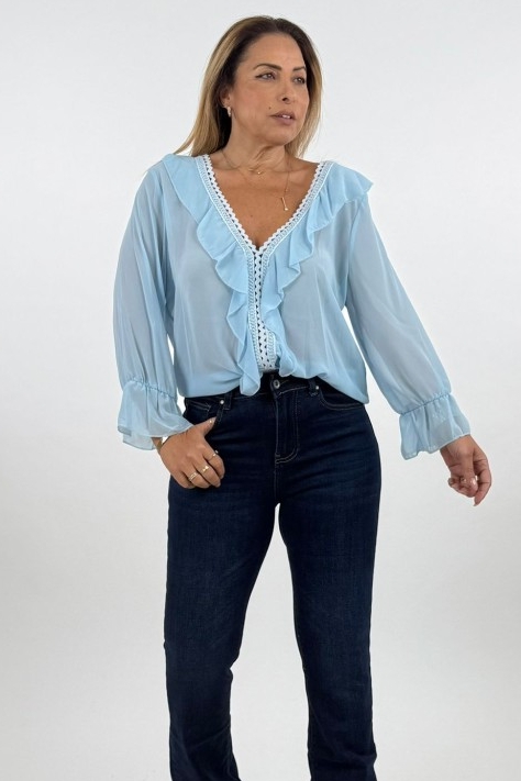 השרוולים ארוכים ומתרחבים קלות, עם סיומת מלמלה רכה שמדגישה את הקו הרומנטי של החולצה.