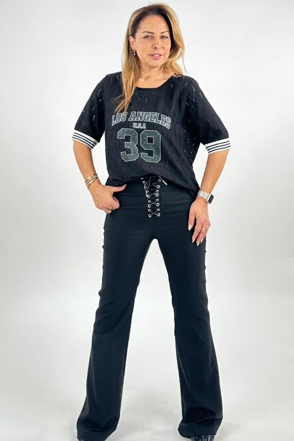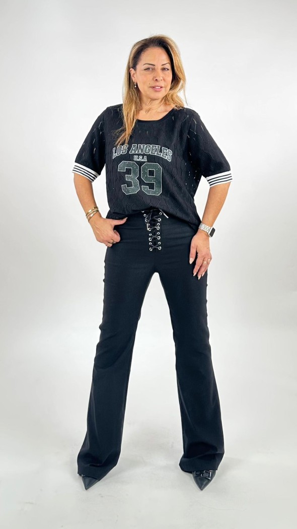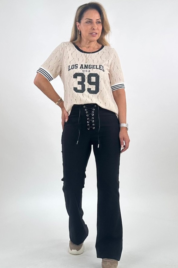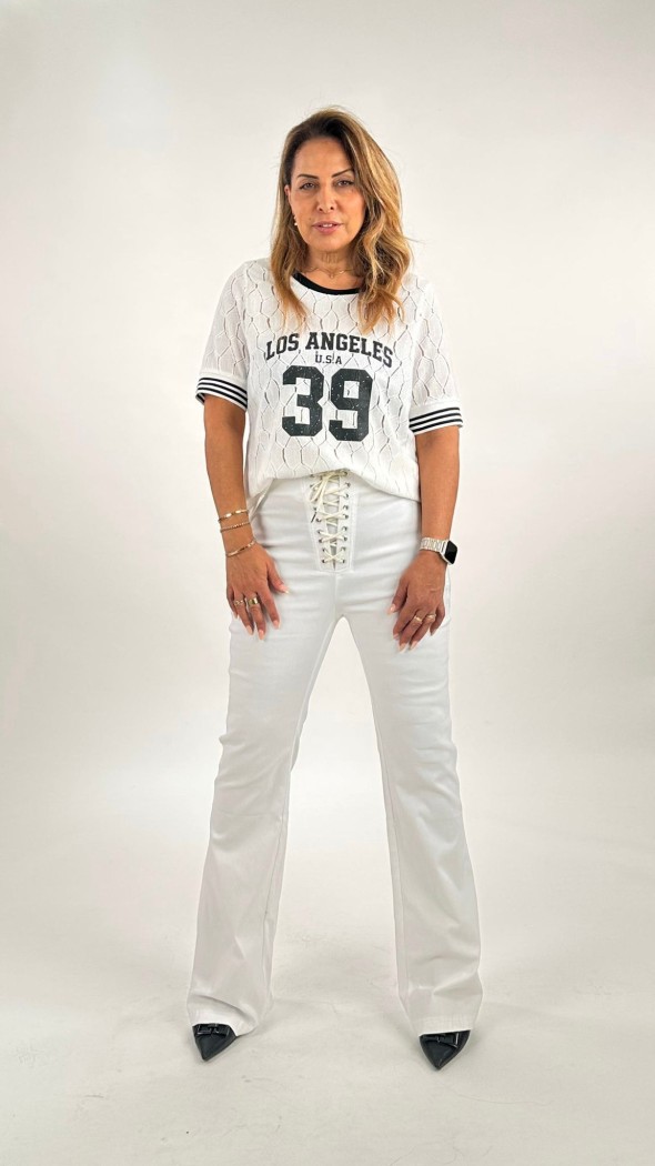 בחזית החולצה מופיע הדפס גרפי בולט של המילים "LOS ANGELES" והמספר "39" בגוון שחור, המזוהה עם אופנת רחוב ספורטיבית.