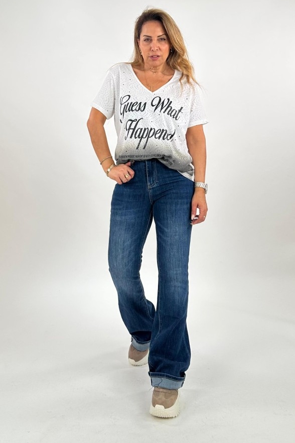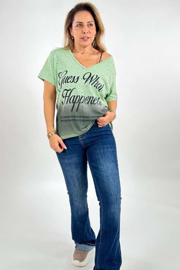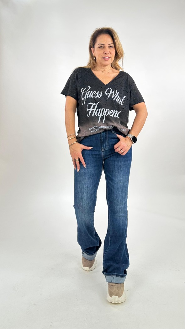היא כוללת הדפס טקסט דומיננטי בחזית בשפה האנגלית: "Guess What Happens", שמעוצב בגופן מסולסל ובולט.