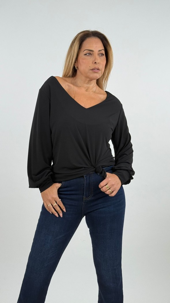 החולצה שבתמונה היא חולצת טי שירט לבנה עם מחשוף V, המעוצבת בסגנון קז'ואל-שיק עם אלמנטים דקורטיביים.