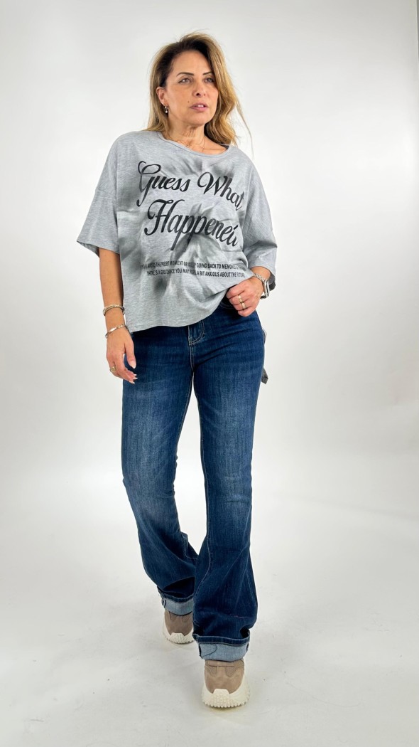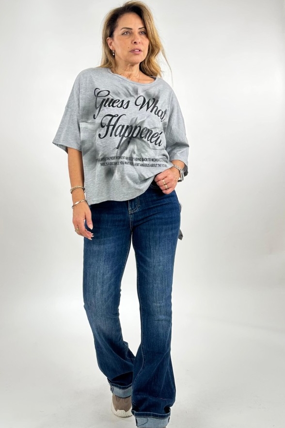 החולצה שבתמונה היא חולצת טי שרט לבנה בגזרת אוברסייז רחבה ונינוחה,