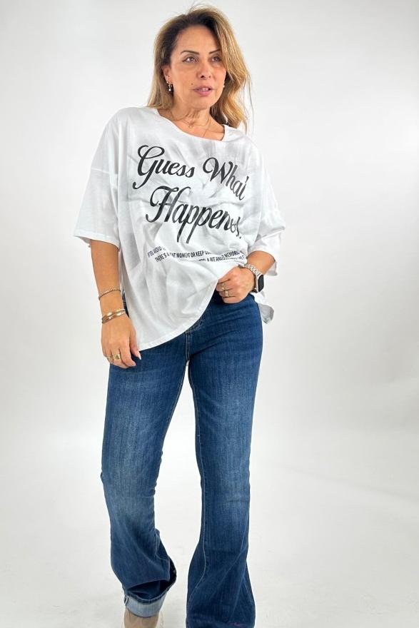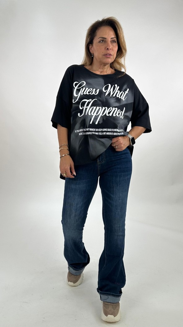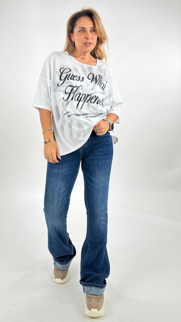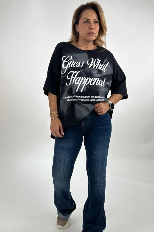 בשילוב הדפס גרפי דומיננטי של הכיתוב "Guess What Happens" בגופן קליגרפי שחור.