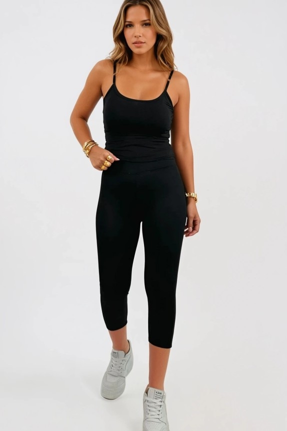 הטייץ שבתמונה הוא טייץ בסיס שחור (7/8), מעוצב עם מותן גבוהה למראה מחטב ותומך.