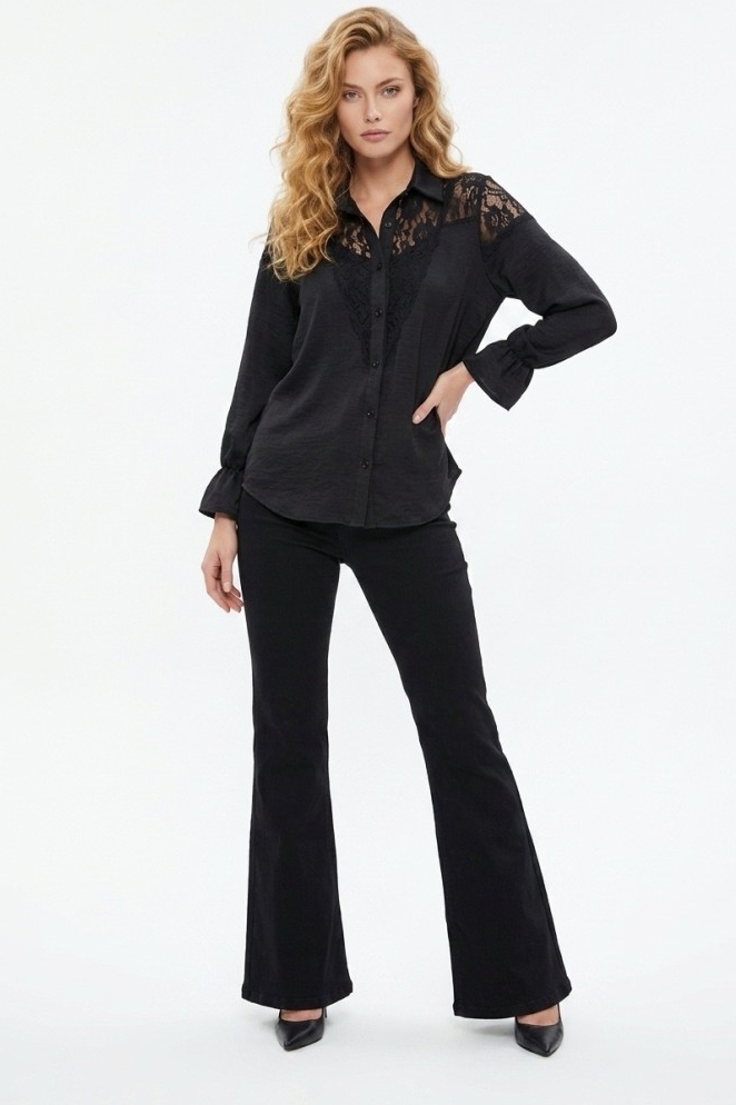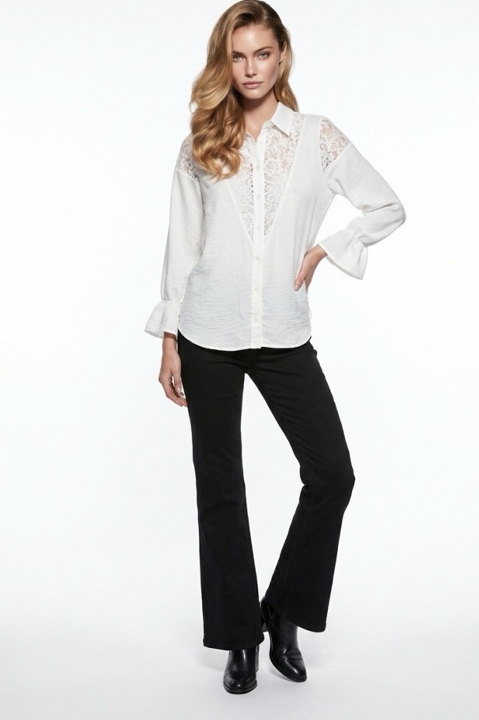 שילוב תחרה המאפיין הבולט ביותר הוא עיטורי התחרה הפרחוניים והשקופים הממוקמים באזור הכתפיים ובחזית החולצה. זהו עיצוב המעניק לחולצה מראה יוקרתי ומתאים במיוחד לאירועים או לערב.