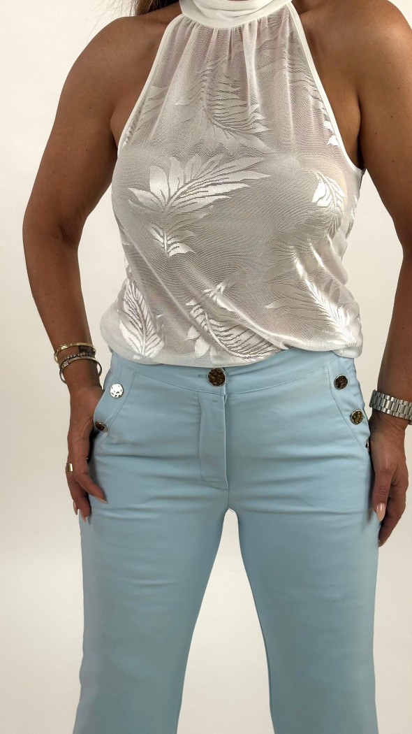 גופיית ריב קלאסית בצבע לבן, המשלבת מראה בסיסי ונקי עם אלמנט עיצובי יוקרתי בכתפיים.