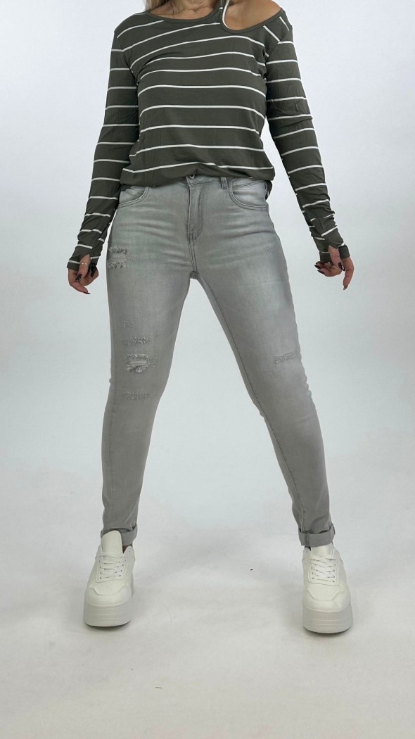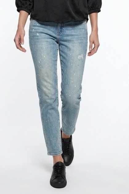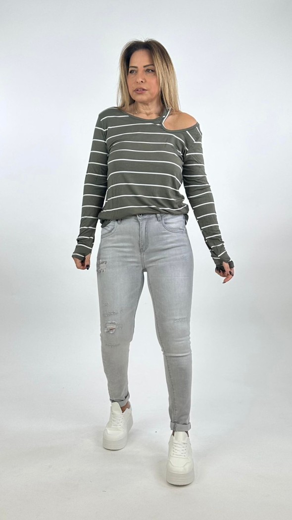 הג'ינס שבתמונה הוא ג'ינס סקיני בגוון כחול בהיר, המאופיין בעיצוב "מלוכלך" ואמנותי