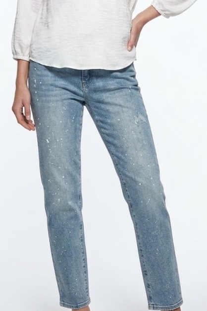 כתמי צבע: עיטורים של כתמי צבע לבנים קטנים הפזורים לכל אורך המכנסיים.