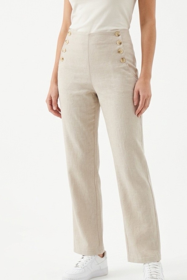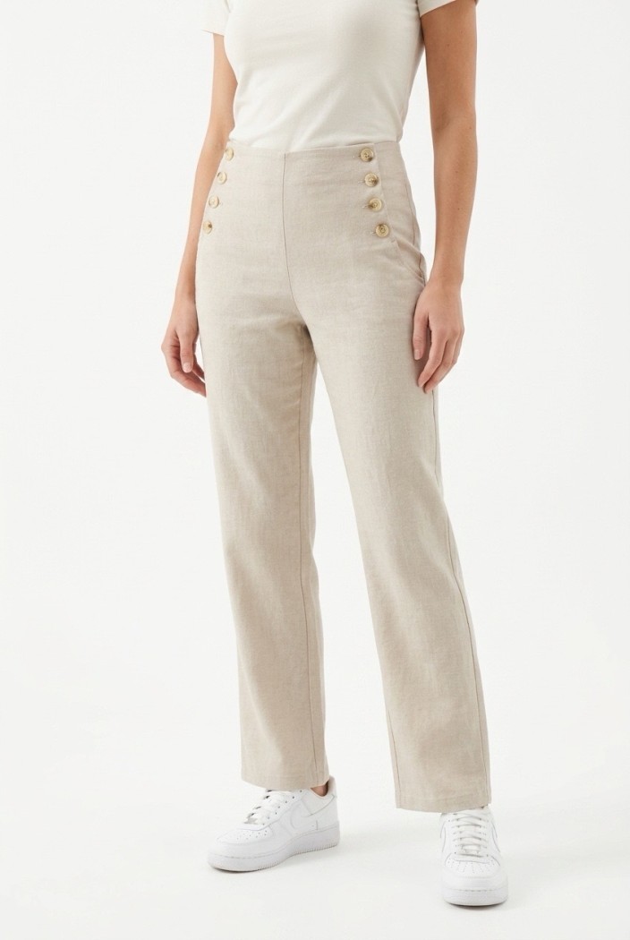 סוג הבד: המכנסיים נראים כעשויים מתערובת פשתן (Linen) או בד דמוי פשתן. בד זה מאופיין בנשימה מקסימלית ובטקסטורה מעט מגורענת וטבעית, מה שהופך אותם לאידיאליים לימים חמים