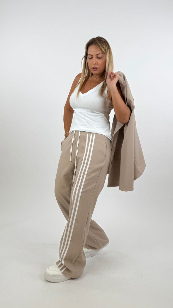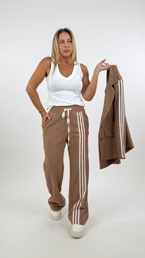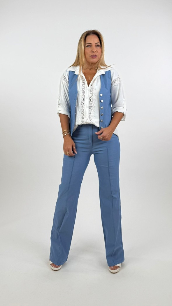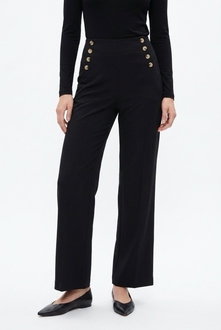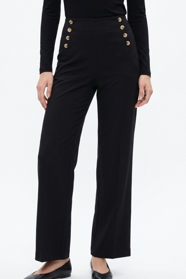 גזרה ומותן: המכנסיים בעלי מותן גבוה מחמיא המדגיש את קו המותניים, וגזרה ישרה המעניקה מראה מוארך לרגל.
